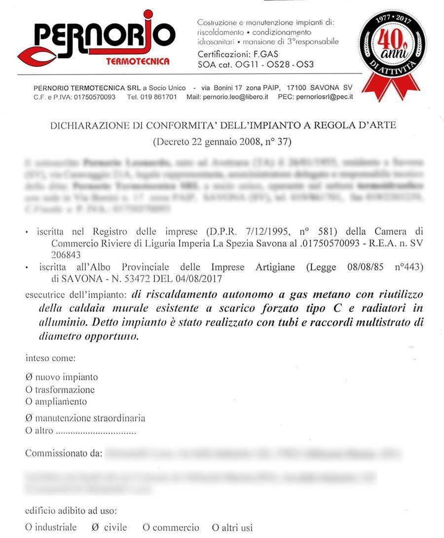 - inoltre certifica la sicurezza dell’impianto e la sua conformità alle norme tecniche e alle leggi attualmente in vigore.